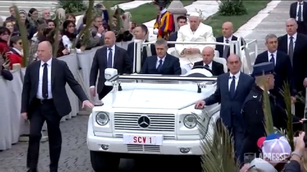 Papa Francesco arriva alla messa della Domenica delle Palme sulla Papa-Mobile, appena 24 ore dopo essere stato dimesso dal Gemelli. Il Pontefice era ricoverato al policlinico da mercoledì sera, per quella che si è rivelata essere una bronchite. (Vatican Media)