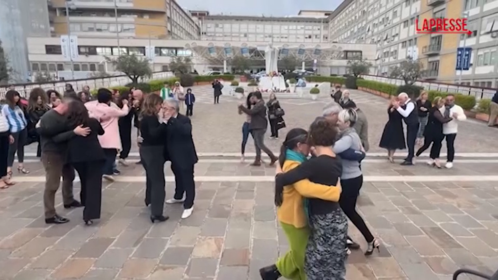 La comunità tanguera di Roma ha voluto portare il proprio saluto a Papa Francesco sulle note del tango nel piazzale antistante il policlinico Gemelli. Tra i promotori Daiana Guspero, coreografa e ballerina che già si è esibita davanti al papa nel 2014. “Sono stata la seconda ballerina a ballare per un Pontefice – speiga Daiana Guspero – Ero molto emozionata perché so che a Papa Francesco ama il tango. Siamo voluti venire qui per regalargli questa nostra preghiera e so che lui apprezzerà tantissimo”.