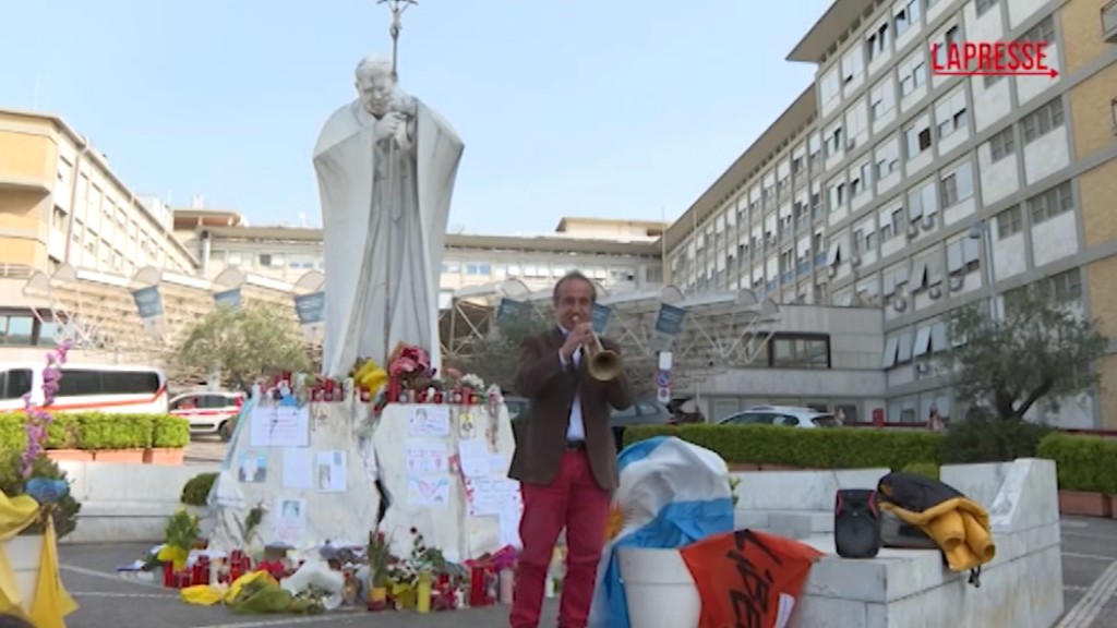 Un trombettista ha eseguito venerdì una serenata di “Ave Maria” sotto le finestre di Papa Francesco all’ospedale Gemelli di Roma. La performance ha avuto luogo davanti alla statua di Giovanni Paolo II, dove i fedeli hanno lasciato messaggi, candele e fiori mentre pregano per la guarigione del Papa.