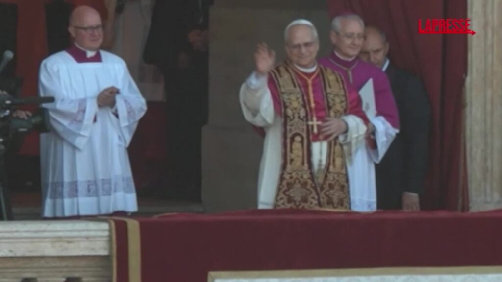 Il nuovo Papa Leone XIV, il cardinale Prevost, saluta la folla a piazza San Pietro commosso con la mano, tra gli applausi scroscianti della folla. Il Pontefice è stato eletto al quarto scrutinio del conclave oggi, 8 maggio 2025.