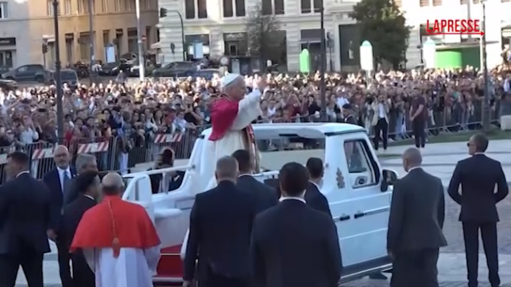 Papa Leone XIV saluta i fedeli in piazza, a bordo della papamobile, al termine della cerimonia di insediamento come vescovo di Roma nella Basilica di San Giovanni in Laterano.
