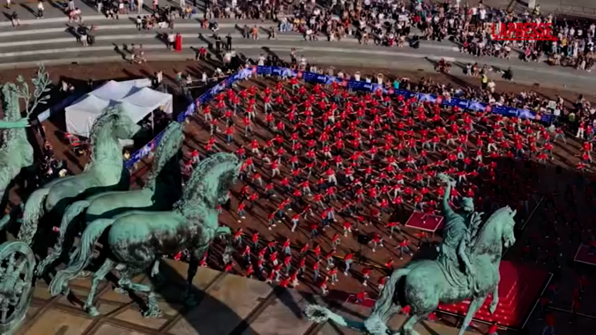 Milano ha ospitato il nuovo BalloRosso di Roberto Bolle: oltre 1.500 ballerini da tutta Italia si sono radunati davanti all’Arco della Pace per una coreografia collettiva sulle note del Bolero di Maurice Ravel. Le suggestive immagini dall’alto mostrano un organismo unico che pulsa e danza, celebrando la bellezza e la condivisione della danza.