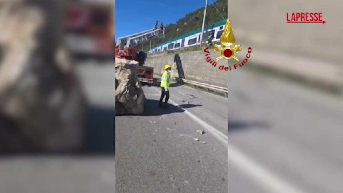 Un grosso masso è caduto sulla strada statale 36 “del Lago di Como e dello Spluga” nel comune di Abbadia Lariana (Lecco), invadendo la carreggiata. La caduta massi ha interessato anche la vicina linea ferroviaria che è stata interrotta. Un treno è stato fermato all’altezza della frana ed è in corso l’evacuazione degli oltre 150 passeggeri presenti nel convoglio di Trenord. I Vigili del fuoco intervenuti sul posto hanno utilizzato un’autoscala per evacuare il treno.