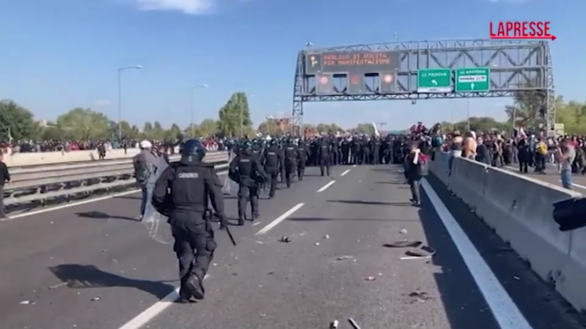 Scontri tra manifestanti e forze dell’ordine a Bologna durante il corteo a sostegno della Global Sumud Flotilla nel giorno dello sciopero generale. Alcuni dimostranti con il volto coperto hanno forzato il cordone per cercare di avanzare in Tangenziale e le forze dell’ordine hanno effettuato delle cariche. Gli agenti hanno caricato con i manganelli i manifestanti scesi in corteo.