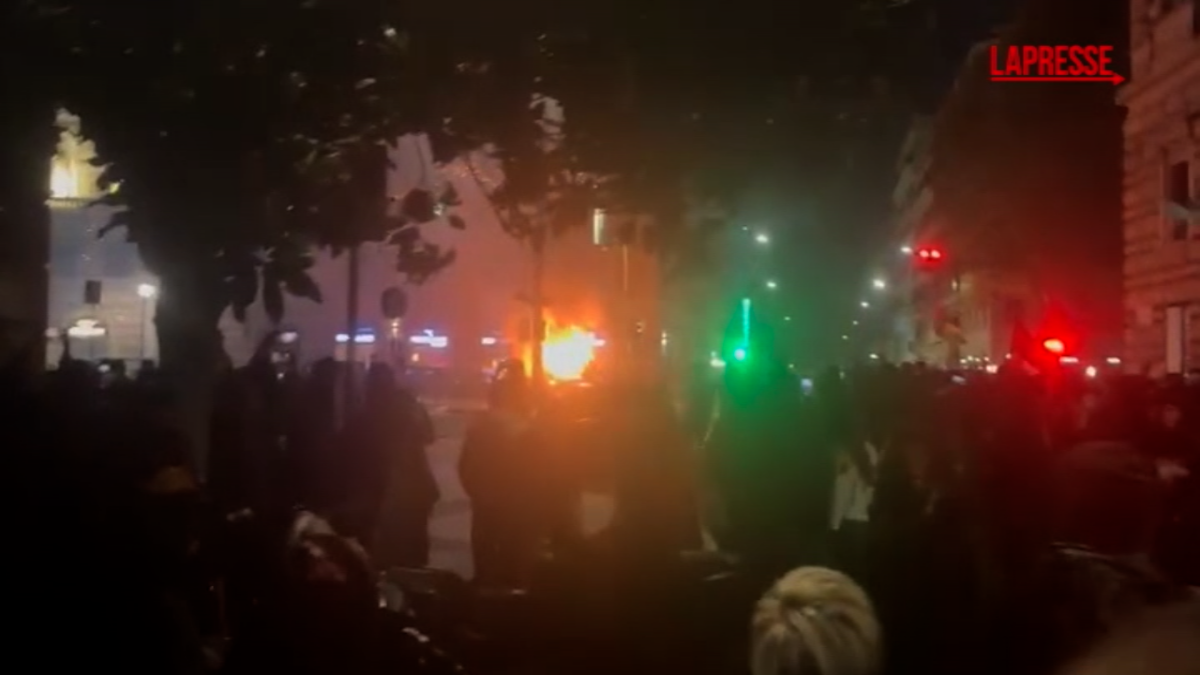 Scontri tra manifestanti e forze dell’ordine in via Merulana a Roma. Dai manifestanti sono stati lanciati fumogeni all’indirizzo delle forze dell’ordine, uno dei quali ha causato l’incendio di un’auto civetta della polizia. Le forze dell’ordine in tenuta anti sommossa hanno risposto con una carica.
