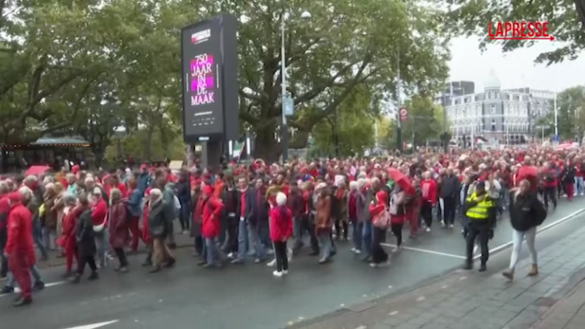 (LaPresse) Migliaia di persone vestite di rosso si sono radunate domenica ad Amsterdam nella terza manifestazione pro-Gaza del movimento ‘Rode Lijn’ (‘Linea Rossa’) dopo quelle dell’Aja di maggio e di giugno che avevano attirato decine di migliaia di partecipanti. L’obiettivo del corteo è spingere il governo dei Paesi Bassi ad adottare misure più dure contro Israele per porre fine alla guerra, che dura ormai da quasi due anni, nella Striscia. La protesta e la marcia di domenica per le strade della capitale olandese si svolgono a meno di quattro settimane dalle elezioni nazionali. La manifestazione è arrivata un giorno dopo le marce di centinaia di migliaia di italiani e spagnoli a Roma, Barcellona e Madrid, sabato, a testimonianza della crescente indignazione internazionale per la campagna militare israeliana a Gaza.