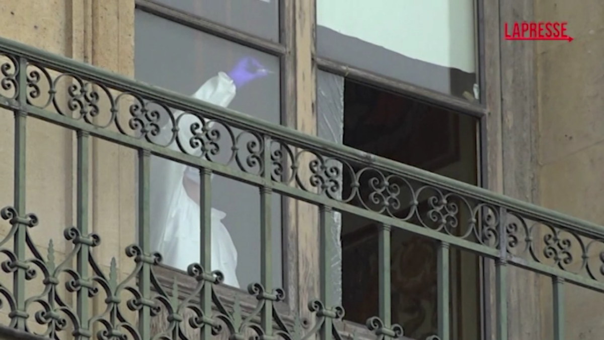 In un furto durato pochi minuti domenica all’interno del museo più visitato al mondo, alcuni ladri sono saliti con un ascensore a cestello al Louvre, hanno forzato una finestra della Galerie d’Apollon, hanno rotto le vetrine e sono fuggiti con gioielli di inestimabile valore. In queste immagini i rilievi degli investigatori della scientifica vicino a una finestra rotta del museo. Si tratta di uno dei furti più eclatanti avvenuti in un museo negli ultimi tempi. Secondo il ministro della Cultura francese, Rachida Dati, un oggetto è stato successivamente ritrovato all’esterno del museo. Il quotidiano francese Le Parisien ha riferito che si trattava della corona tempestata di smeraldi dell’imperatrice Eugenia, moglie di Napoleone III, in oro, diamanti e con aquile scolpite. Il furto, ha dichiarato Dati, è durato quattro minuti.