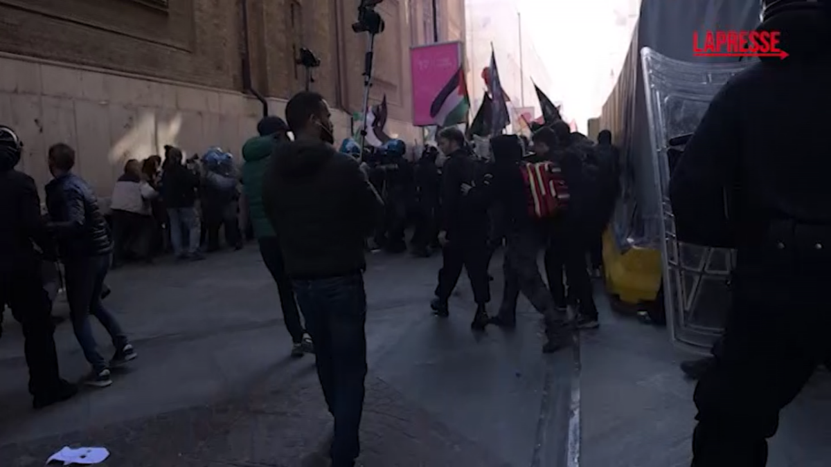 (LaPresse) Momenti di tensione fra manifestanti pro Pal in corteo a Torino e forze dell’ordine. E’ partita una carica dei poliziotti con scudi e manganellate contro i manifestanti che erano venuti a contatto urlando “fateci passare” in via Accademia delle Scienze. La carica è durata circa un minuto e il corteo arretrato di qualche decina di metri prima che si ripristinasse la normalità. I dimostranti contestano i ministri i Tajani, Zangrillo, Pichetto Fratin e Bernini presenti agli Stati Generali della Casa in corso al Teatro Carignano, definiti dai Pro Pal “ministri della guerra e del genocidio“.