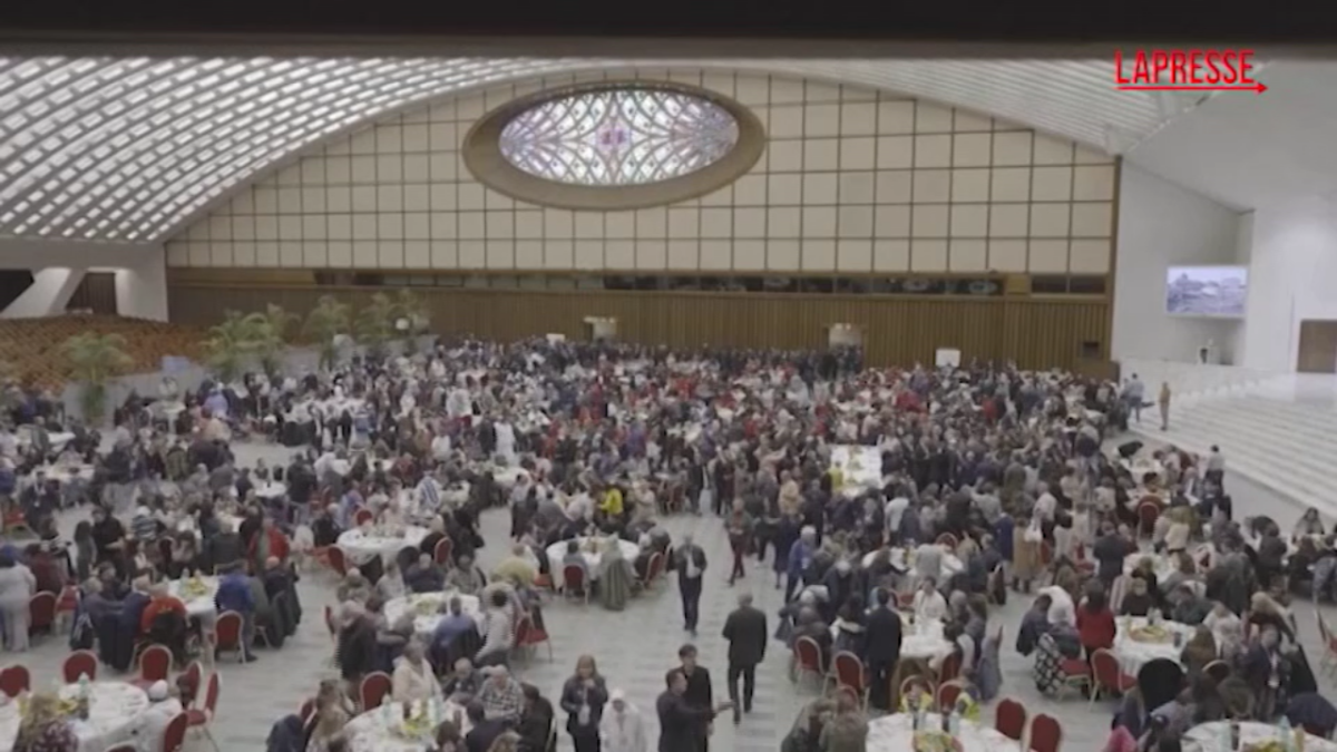 Le immagini del pranzo ospitato da Papa Leone XIV domenica 16 novembre nell’Aula Paolo VI in Vaticano per circa 1.300 persone svantaggiate, in occasione del Giubileo dei Poveri. “Aiutaci tutti a camminare sempre uniti nel tuo amore. Te lo chiediamo nel nome di Gesù Cristo, nostro Signore. Amen. Buon pranzo e auguri!“, ha detto il Pontefice nel suo discorso prima del pranzo. Il menù prevedeva una porzione di lasagna di verdura come primo, seguita da una cotoletta con contorno di verdure e, al termine, un dolce. I poveri e le persone in difficoltà che hanno partecipato al pranzo sono assistiti da organizzazioni cattoliche e provengono da diversi contesti e paesi.