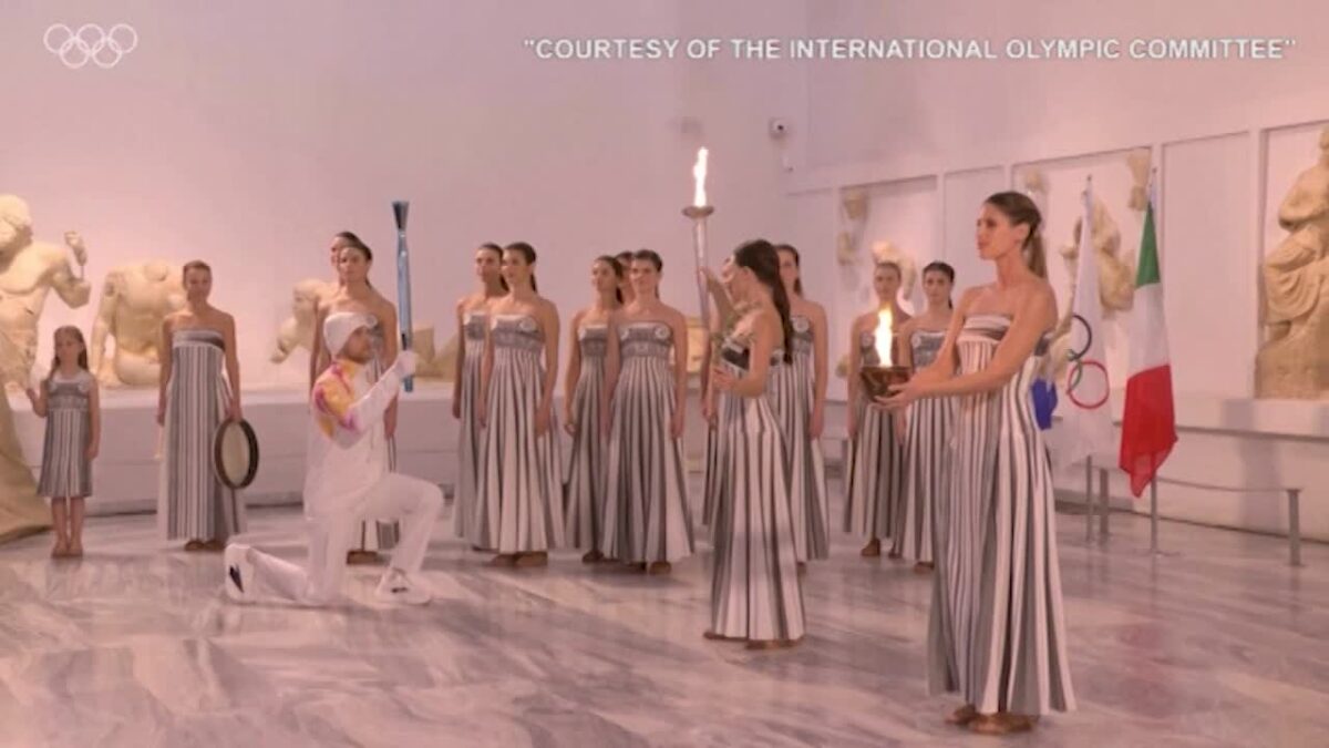 Dopo essere stata accesa durante la cerimonia nel Tempio di Hera ad Olimpia, in Grecia, la fiamma olimpica può finalmente cominciare il suo viaggio. In queste immagini il canottiere greco Petros Gaidatzis dà il via alla staffetta della torcia che, dopo aver raggiunto l’Italia, sarà portata attraverso il Paese ospitante da circa 10.000 corridori prima delle competizioni che si terranno dal 6 al 22 febbraio. Gaidatzis è accompagnato dalla fuoriclasse dello sci di fondo Stefania Belmondo.