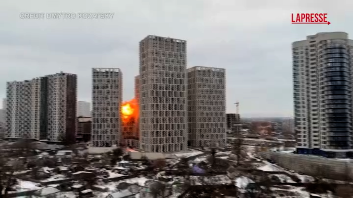 Un video girato sabato mattina sembra mostrare il momento in cui un drone che colpisce un palazzo a Kiev. Il filmato immortala un’esplosione nella parte superiore dell’edificio nella capitale ucraina e mostra poi da vicino i danni e l’incendio provocati. La Russia ha attaccato la capitale ucraina con missili e droni nelle prime ore di sabato, uccidendo una persona e ferendone 27, alla vigilia del nuovo incontro tra Zelensky e Trump in Florida. Il ministero della Difesa russo ha dichiarato di aver effettuato un “attacco massiccio” durante la notte, utilizzando “armi a guida di precisione a lungo raggio da terra, aria e mare, compresi missili aerobalistici ipersonici Kinzhal” e droni, aggiungendo che si è trattata di una risposta agli attacchi dell’Ucraina contro “obiettivi civili” in Russia.