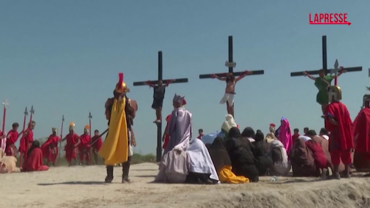 Nella Filippine i fedeli cattolici hanno celebrato il Venerdì Santo con una rievocazione della crocifissione di Gesù nella città di San Fernando, a nord della capitale Manila, una tradizione nella provincia di Pampanga. Oltre un centinaio di persone hanno assistito alla scena in cui alcuni fedeli sono stati apparentemente inchiodati a croci di legno. Il rituale è ripreso nel 2023 dopo una pausa di tre anni dovuta alla pandemia di Covid. A interpretare Cristo è Ruben Enaje, un 65enne, arrivato alla sua 37esima rievocazione. Lo spettacolo cruento attira ogni anno durante la Settimana Santa folle di persone da tutto il mondo, nonostante tali rievocazioni siano disapprovate dai vertici della Chiesa.