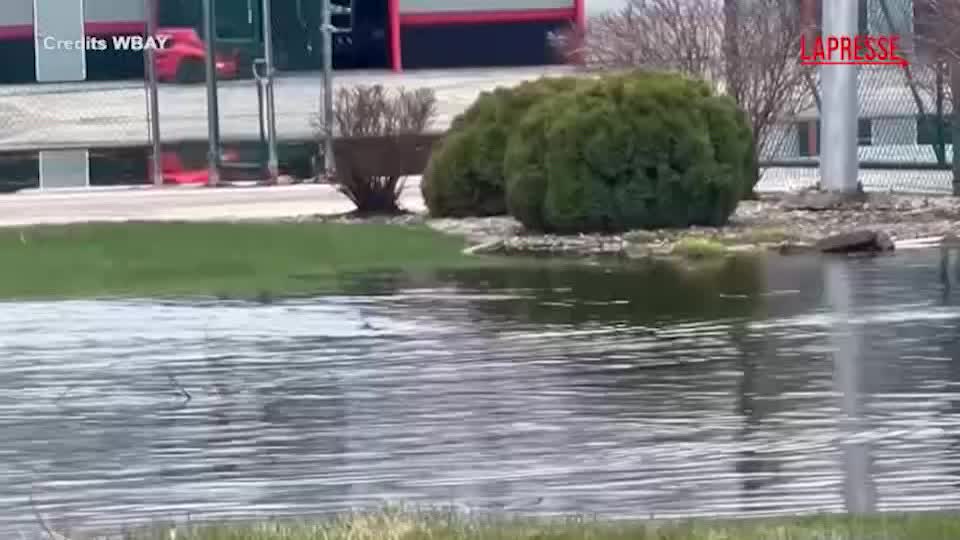 Giovedì la stazione televisiva WBAY di Green Bay, nel Wisconsin, ha mostrato un video in cui appaiono alcuni storioni che nuotano in un parcheggio allagato nella contea di Outagamie, nel Wisconsin centrale. I pesci si sono ritrovati in un ambiente a loro decisamente estraneo dopo che il fiume Wolf è esondato durante le forti piogge cadute tra mercoledì e giovedì; il flusso d’acqua avrebbe quindi trascinato gli storioni nel parcheggio, tra l’altro vicino a una famosa zona di pesca.