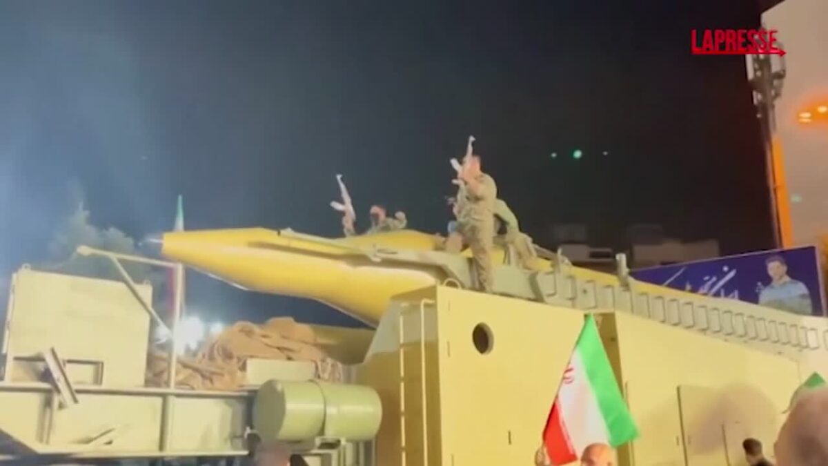 (LaPresse) Gli estremisti iraniani si sono radunati martedì sera con membri della Guardia rivoluzionaria paramilitare iraniana che apparentemente hanno portato missili balistici agli eventi di Teheran. Un filmato trasmesso dalla televisione di Stato iraniana mostra uomini che trasportano fucili d’assalto in stile Kalashnikov su un missile che assomiglia a un missile balistico Qadr nella capitale iraniana, Teheran, a bordo di un lanciatore mobile. I sostenitori hanno scandito slogan anti-USA e anti-Israele.